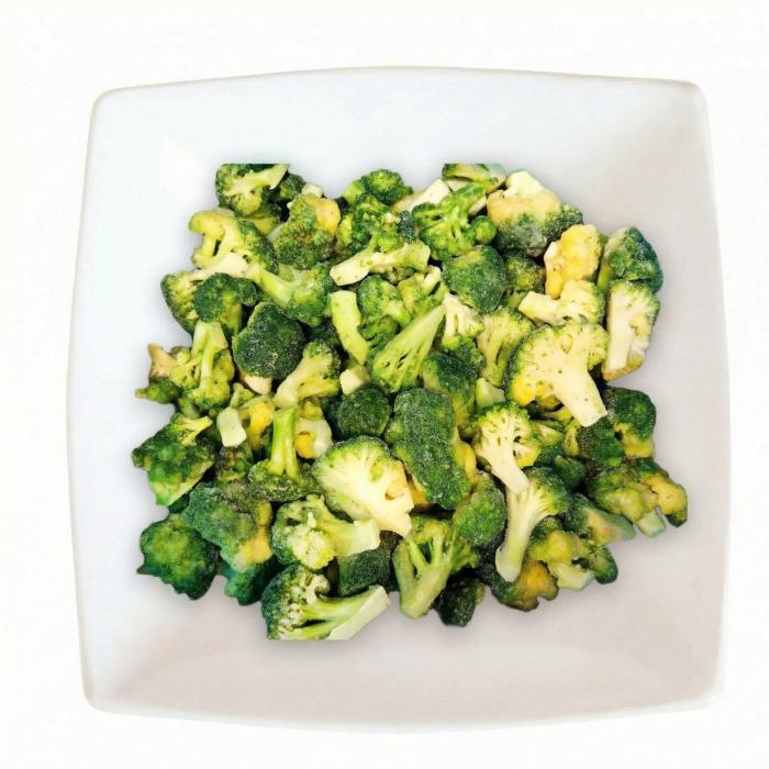 Соцветия брокколи при шоковом охлаждении не теряют витамины и минералы.Сохраняется витамин С и фолиевая кислота (витамин B9). Эта капуста опережает все овощи по содержанию минералов и витаминов.